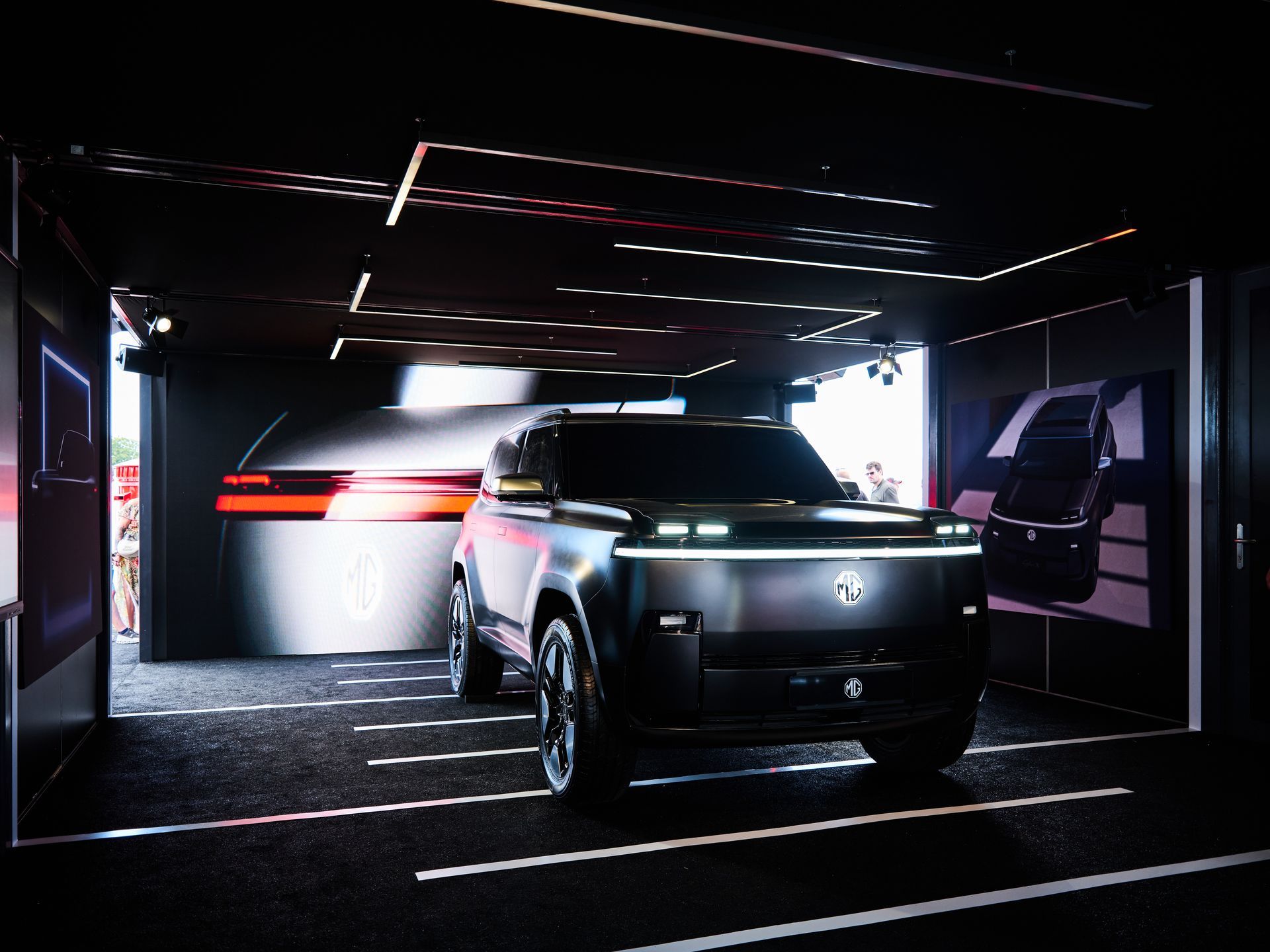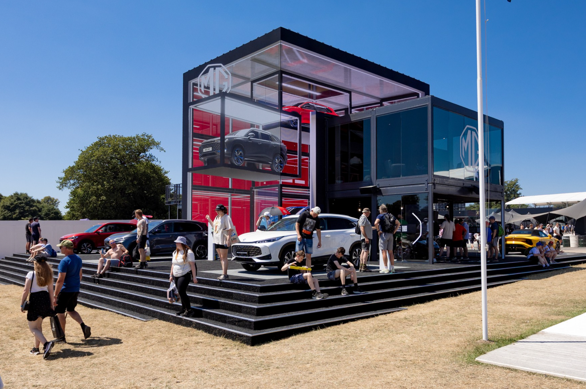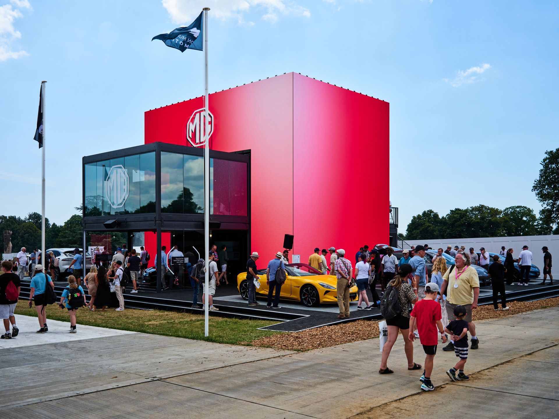 Externally, the cube towered above the Goodwood site as a futuristic monolith, showcasing the Cyber X in motion, from dramatic design close-ups to animated pop-up headlights. Internally, guests stepped into a more intimate experience space, where they could interact with physical elements and immersive digital content that told the full story of MG’s heritage and forward-thinking innovation.