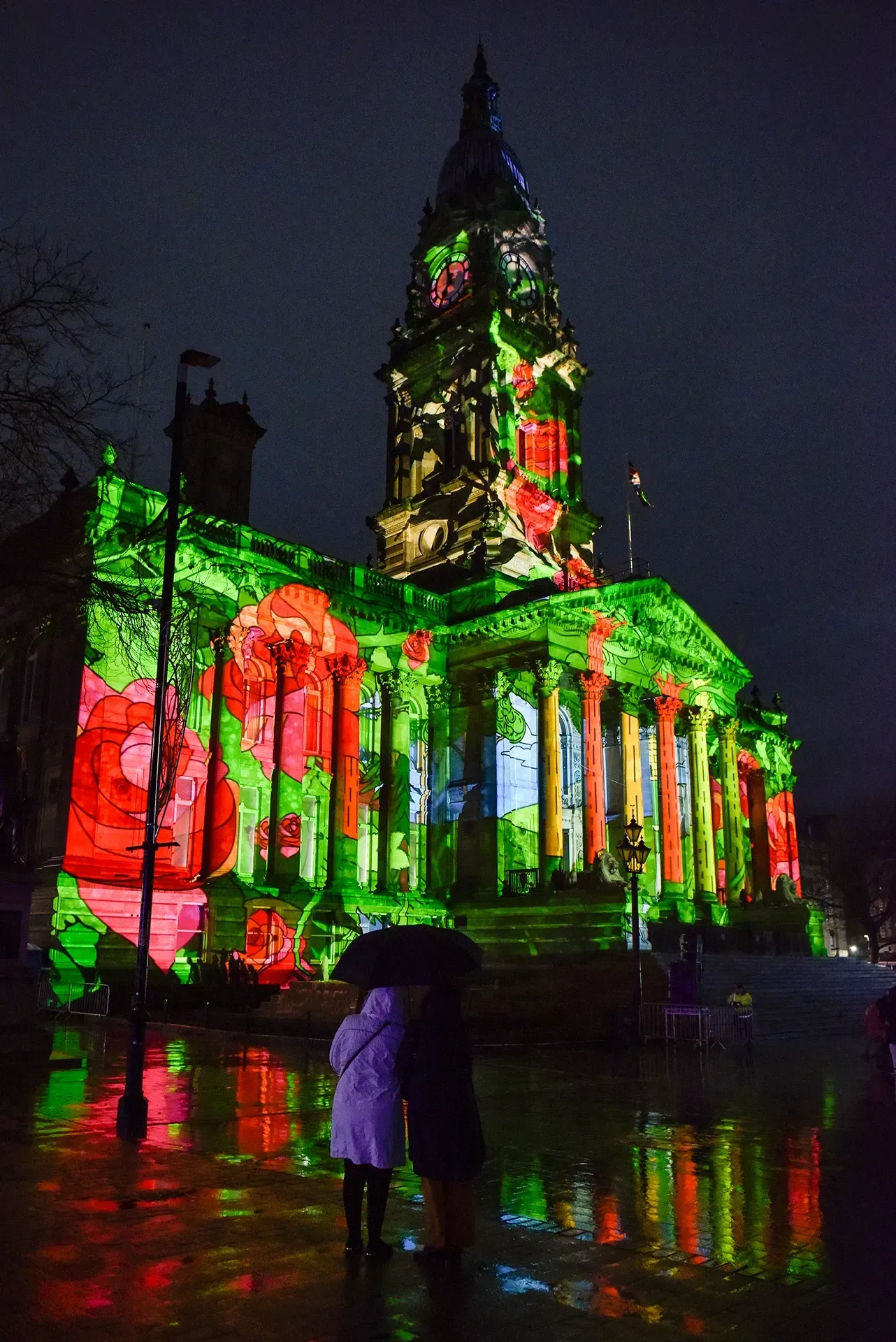The Town Hall’s vast façade (50m wide, 61m high), dark stone surface, and detailed architecture, including towering portico pillars and a prominent clock tower, posed major challenges. Achieving the creative vision required 150–180 LUX brightness, perfect projection across three building sides, and seamless integration of the staircase, all while avoiding shadows and maintaining flawless clarity.